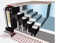 Durch die spezielle Konstruktion wird das Becken in einem Arbeitsgang gegossen (Boden und Wand). Es handelt sich also um ein Einstückbecken, dessen Beständigkeit und Stabilität sehr hoch und damit extrem dauerhaft ist. Weil es zwischen den Etappen Bodenplatte und Wand keine Wartezeit gibt, ist auch die Realisierung viel schneller als mit einem herkömmlichen Betonbecken.