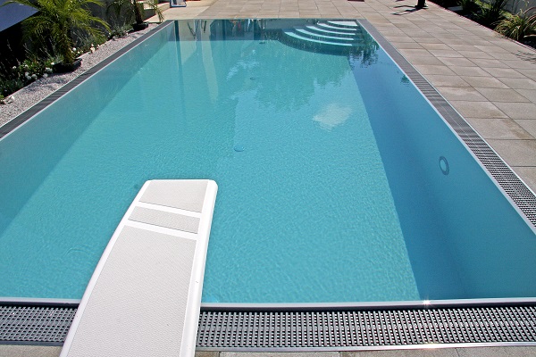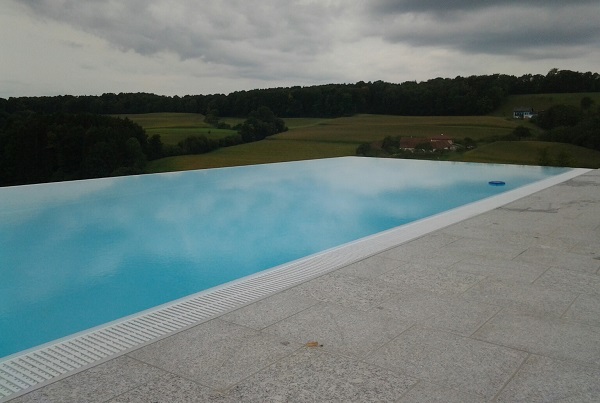 Bei einem Überlaufrinnenbecken wird der Wasserstand auf die Oberkannte des Beckens angehoben. Dadurch sieht man keine Beckenwände. Das Wasser läuft in der Rinne zum Ausgleichstank. Von dort saugt die Filterpumpe an und das gereinigte Wasser wird dann wieder ins Becken gepumpt. Das Wasser im Becken wirkt wie ein Spiegel - ein einmaliges optisches Erlebnis!