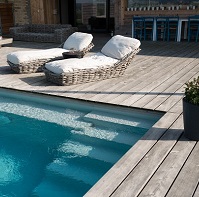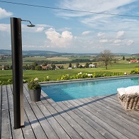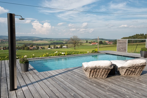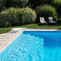 Mit einem ganz speziellen Skimmer kann der Wasserstand im Becken auf ca. 5 cm unter dem Beckenrand angehoben werden. Dadurch entsteht ein sehr schönes Bild, weil die Beckenwand fast nicht mehr sichtbar ist. Ausserdem ist der Wasserstand im Becken um bis zu 10 cm höher als bei Standardbecken.